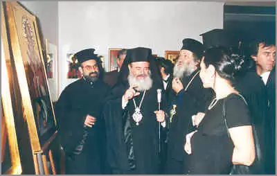 Ο Μακαριώτατος Αρχιεπίσκοπος Αθηνών και πάσης Ελλάδος κυρός Χριστόδουλος και ο Πρωτοσύγγελος π. Θωμάς Συνοδινός εις τά εγκαίνια της εκθέσεως του Πανελληνίου Συλόγου Αγιογράφων 3/11/1999
